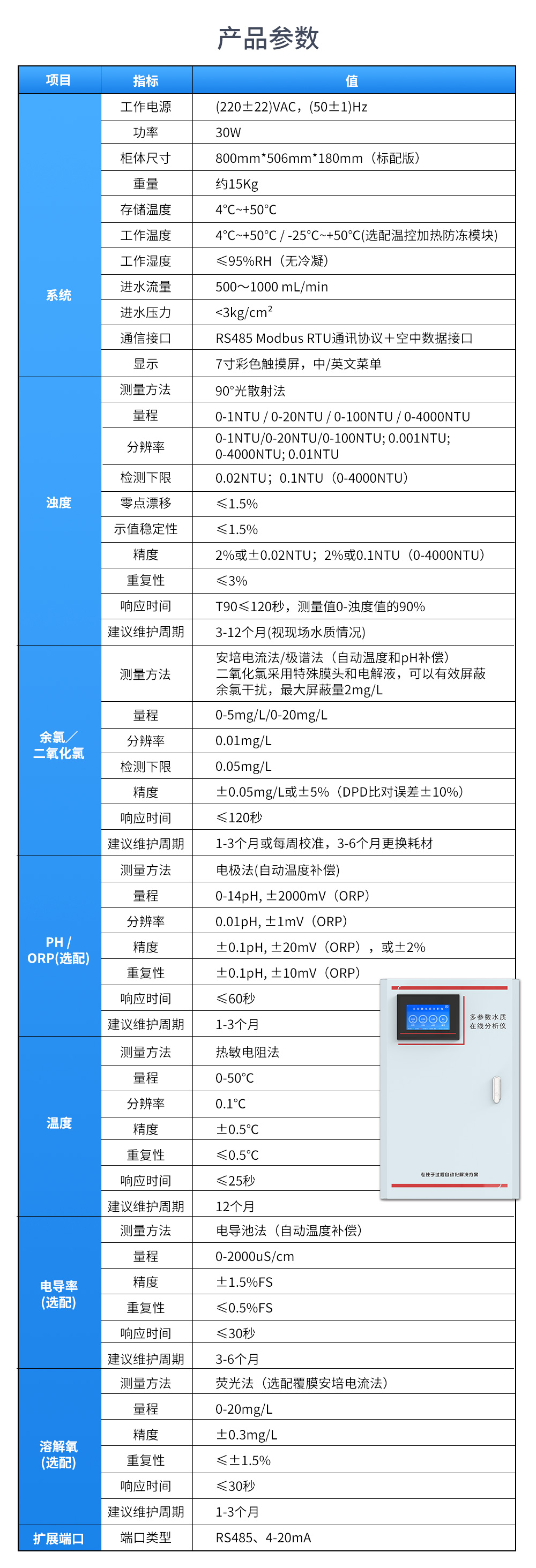 多參數水質在線分析儀是本公司自主研發制造的新一代飲用水水質監測設備,該設備可廣泛用于城市或村鎮自來水廠、自來水輸水管網、自來水二次供水、用戶末梢、室內游泳池、大型凈水設備和直飲水等水質在線監測,是水廠生產過程控制、水利水務管理、衛生監督等領域必不可少的在線分析設備。